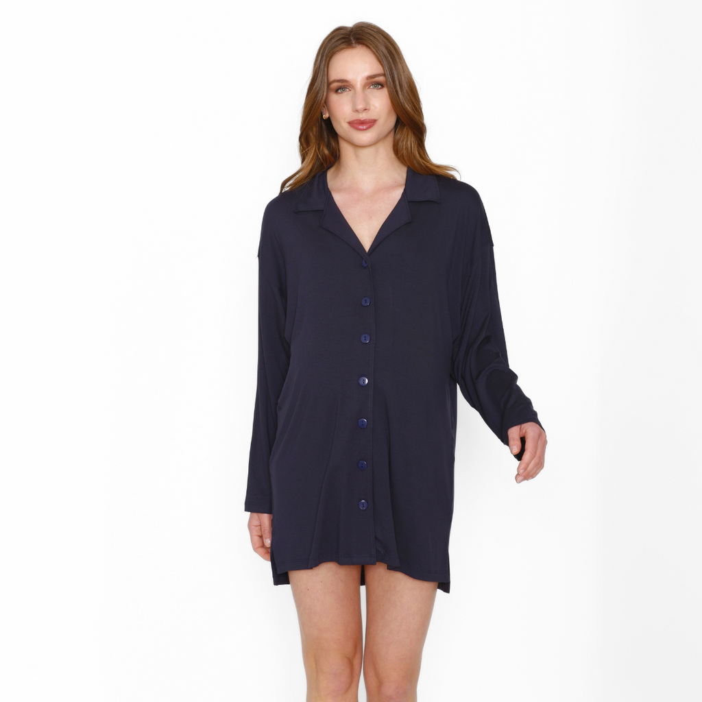 Camisa de Dormir Lactancia Botones Manga Larga Azul Marino