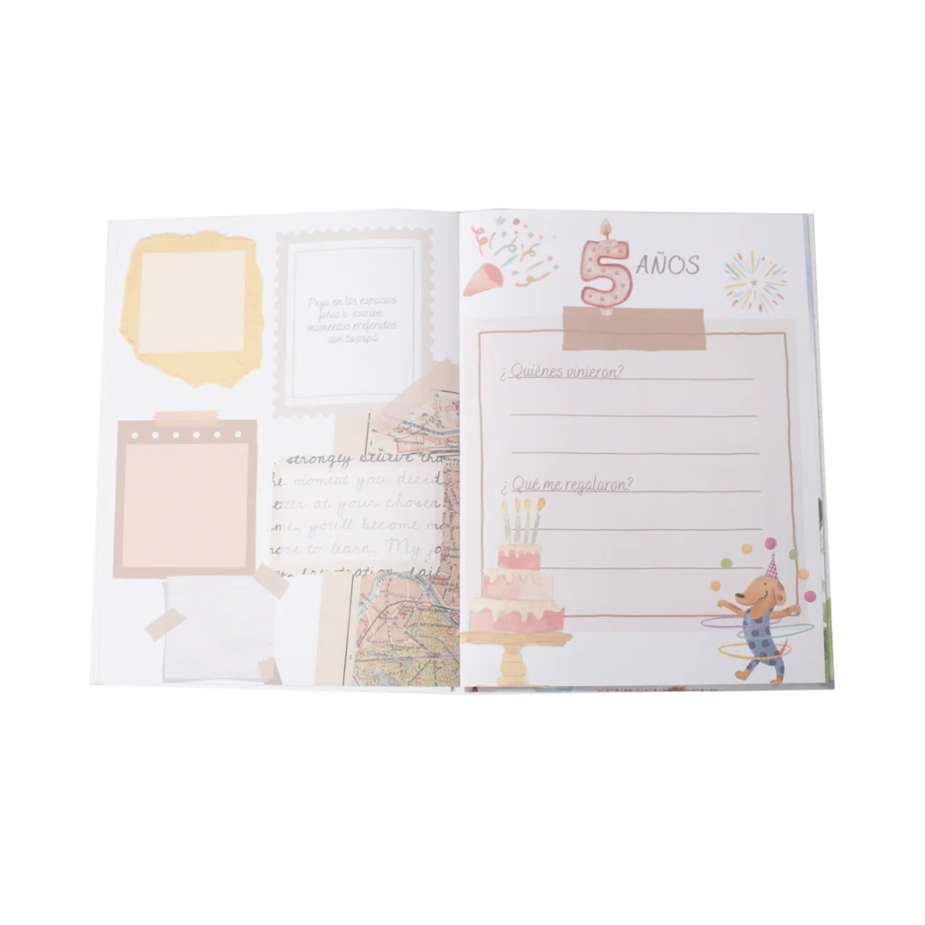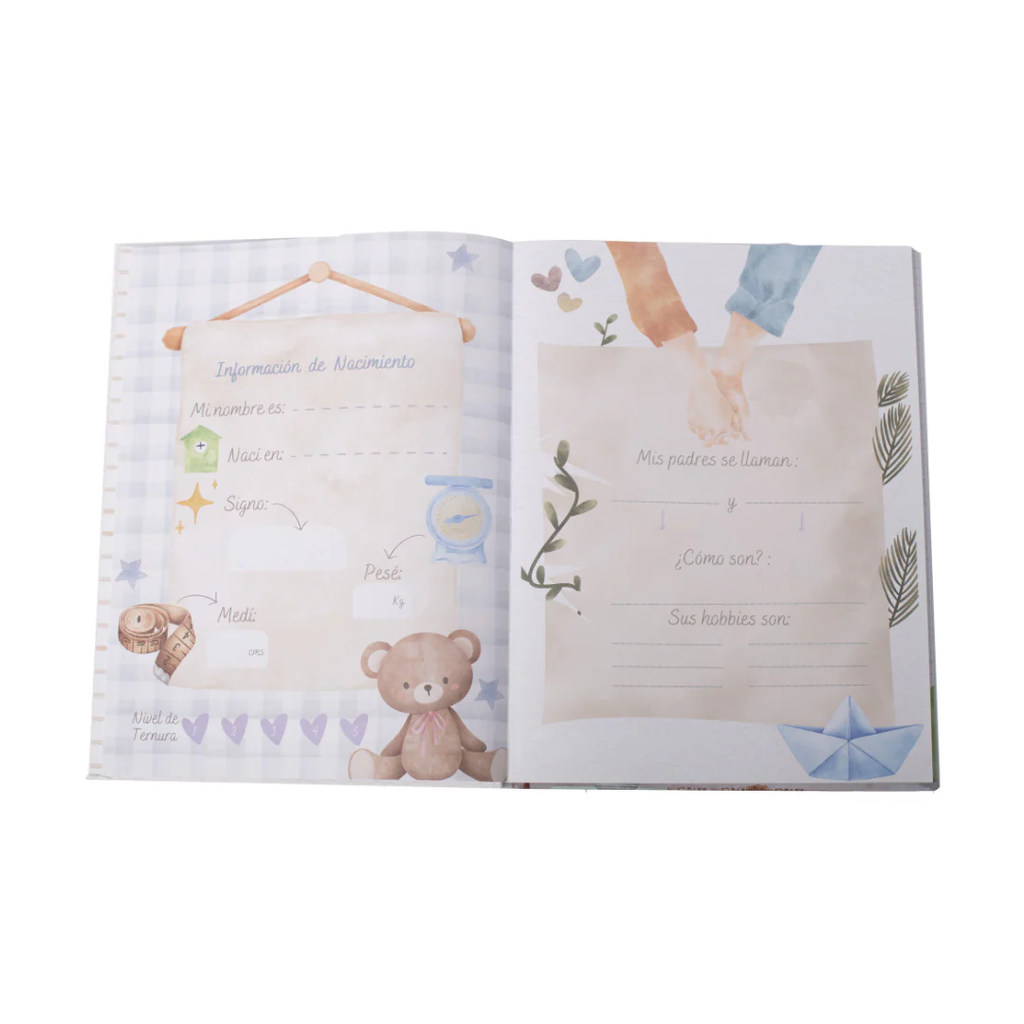 Incluye espacio para anotar detalles del nacimiento, los padres, la familia, los preparativos de su llegada, el bautizo, sus primeras travesuras, celebraciones como Navidad, vacaciones, aprendizajes, primeras palabras y mucho más. Es un regalo ideal para conservar cada hito de manera ordenada, emotiva y con diseño moderno.