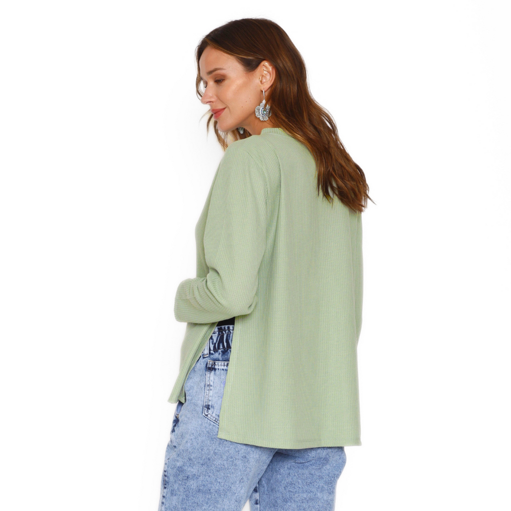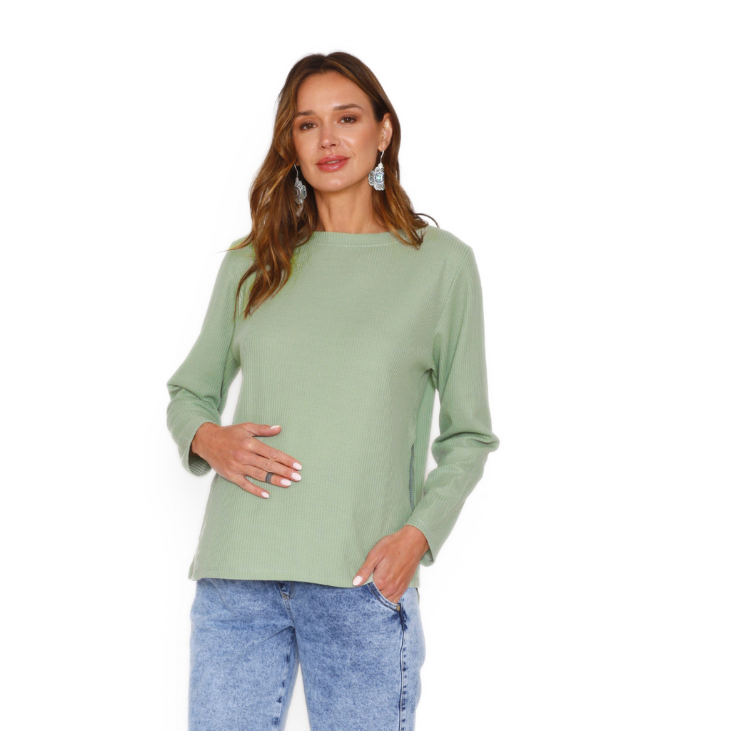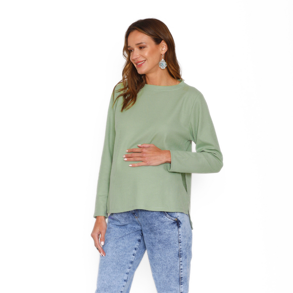 Confeccionado en manga larga y cuello simple, ofrece un calce cómodo y versátil, ideal para el uso diario. De color liso en tela waffle, es una prenda moderna y fácil de combinar con tus tenidas favoritas, aportando un toque elegante y funcional a tu clóset maternal.